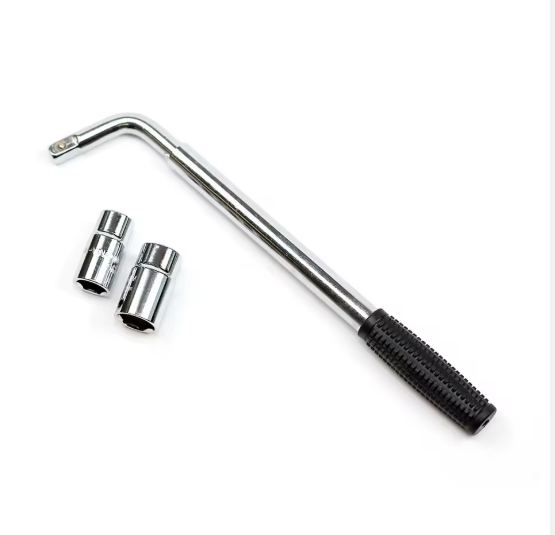Kjo në foto është çelës për rrotat e makinës (quhet edhe “wheel brace” ose çelës L për bulonat e gomës), bashkë me dy soketa (koka të ndërrueshme).