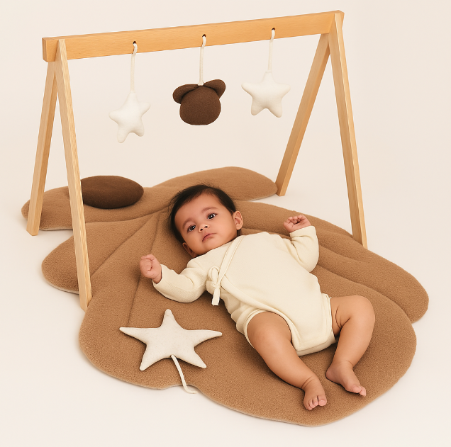 Ky kënd loje me dizajn elegant ofron një hapësirë të ngrohtë dhe të rehatshme për lojërat e para të bebes. Dysheku në formë gjetheje me ngjyrë kafe të butë krijon një ndjesi qetësie, ndërsa struktura prej druri me lodra të varura nxit zhvillimin e shqisave dhe koordinimin e duarve me sytë. Një kombinim perfekt midis funksionalitetit dhe estetikës natyrale, i përshtatshëm për çdo ambient të dhomës së fëmijës.