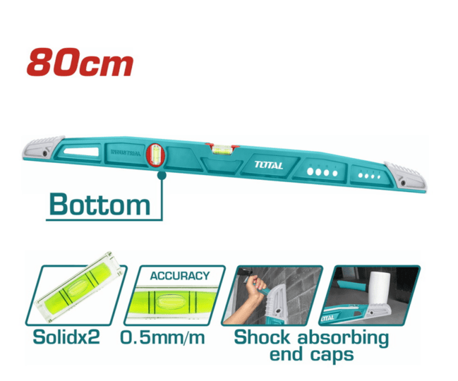 TOTAL Magnetic Level 80mm është një libell profesionale kompakte, e bërë nga alumin industrial, me magnet të fuqishëm dhe saktësi të lartë ±0.5mm/m.