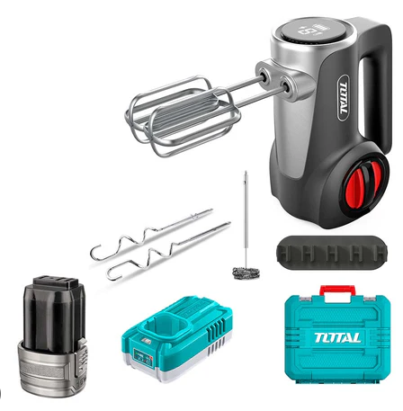 Kjo është një mikser elektrik pa kabllo (Cordless Mixer/Hand Mixer) nga TOTAL Tools, e projektuar për përzierje profesionale në kuzhinë, ndërtim ose punime artizanale që kërkojnë përzierje të shpejtë dhe të qëndrueshme.