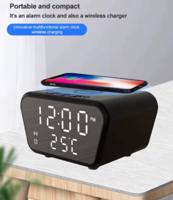 Kjo orë moderne kombinon funksionalitetin e një ore alarmi me teknologjinë e karikimit wireless, duke e bërë të përsosur për çdo tryezë apo komodinë. Dizajni i saj kompakt dhe elegant shfaq qartë orën dhe temperaturën, ndërsa sipërfaqja e saj e posaçme ju mundëson të karikoni telefonin tuaj thjesht duke e vendosur mbi të. Ideale për të kursyer hapësirë dhe për të mbajtur gjithçka të organizuar në mënyrë praktike.