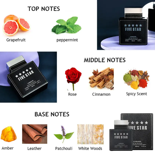 Parfumi “FIVE STAR” nga marca “dahaixingchen” është një aromë e dizajnuar për meshkuj, e cila ofron një kombinim të luleve të freskëta, agrumeve, drurit klasik, dhe nota të tjera që e bëjnë atë një zgjedhje tërheqëse për përdorim të përditshëm. Këtu janë disa detaje rreth këtij parfumi: