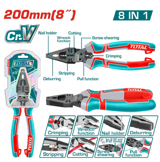 Kjo që po tregon është pinca TOTAL 200mm (8″) 8-in-1, një nga modelet më të avancuara dhe funksionale që ofron marka TOTAL Tools.