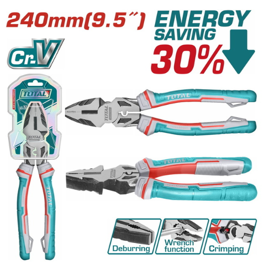Ky është një model heavy-duty i markës TOTAL, i gjatë 240 mm (9.5″), i projektuar për punë më të rënda dhe për të siguruar më shumë leverazh dhe kapacitet force krahasuar me modelet 160 mm ose 200 mm. Simboli Cr-V tregon se është bërë nga çelik krom-vanadium, material që i jep fortësi dhe rezistencë ndaj konsumit dhe ndryshkut. Shënimi “ENERGY SAVING 30%” është një pretendim i prodhuesit që tregues se dizajni (leverage + doreza ergonomike) ul përpjekjen e përdoruesit rreth 30%.
