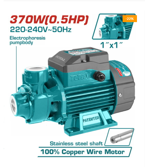 Kjo është një pompë uji centrifugale nga TOTAL, me fuqi 370W (0.5 HP) — e përshtatshme për përdorime shtëpiake dhe bujqësore, si furnizim me ujë nga puse, depozita apo rezervuarë.