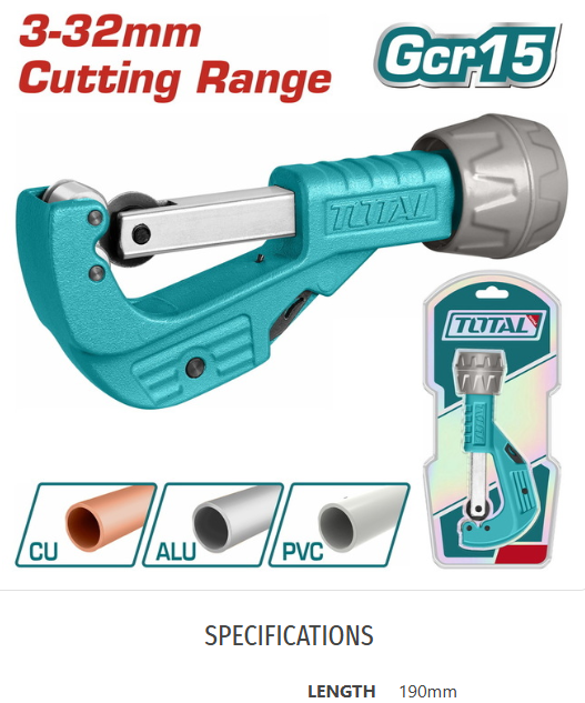 Në përmbledhje, TOTAL Pipe Cutter GCr15 (3–32 mm) është një mjet profesional dhe i besueshëm për prerjen e tubave bakri, alumini dhe PVC, duke ofruar saktësi, forcë dhe jetëgjatësi, të përshtatshme për çdo punë instalimi ose mirëmbajtjeje.