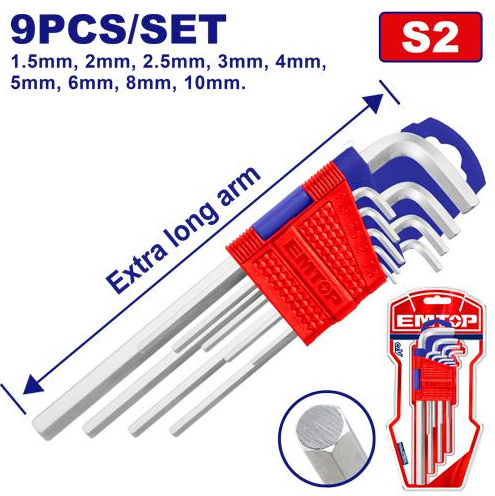 Kjo në foto është një set çelësash imbus (Allen keys) 9 copë, me krah të gjatë “extra long”, marka EMTOP.