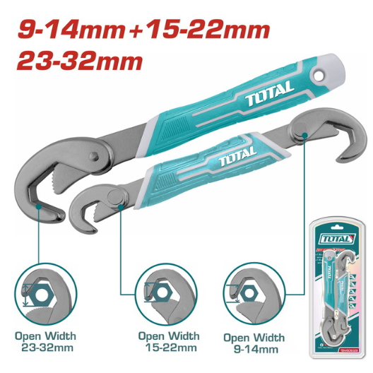 Ky është set çelësash universal TOTAL, i përbërë nga 2 copë, me sistem automatik që përshtatet me shumë madhësi të ndryshme bulonash e dadash.