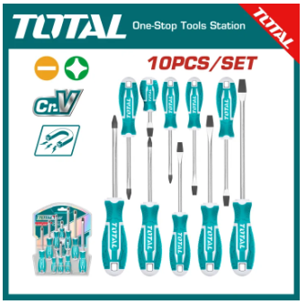 Seti TOTAL 10PCS përfshin kaçavida të tipit Flat (–) dhe Phillips (+) me madhësi të ndryshme për t’iu përshtatur çdo lloj pune.